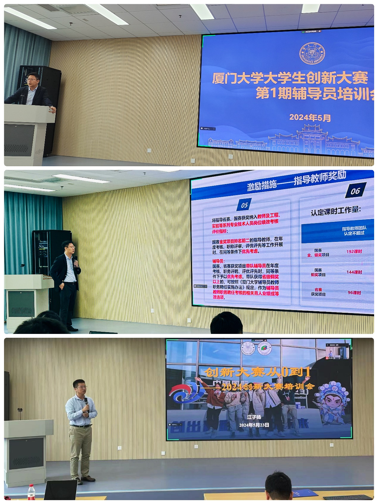 5月23日上午,创新大赛辅导员培训会(第一期)在翔安校区新工科研发大楼218报告厅举办。近日,学校已发布关于举办厦门大学大学生创新大赛(2024)的通知,启动校赛工作,各学院积极组织项目团队踊跃报名参赛。为帮助各学院单位和参赛师生更深入了解大赛、更好地挖掘项目,现代教育技术与实践训练中心、教务处组织了本期培训。培训会采取线上线下相结合的方式。各学院负责大赛参赛组织工作的辅导员和科创秘书等线下参会,学院分管院领导、专任教师线上听会。