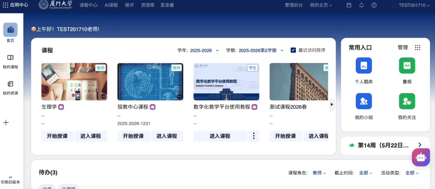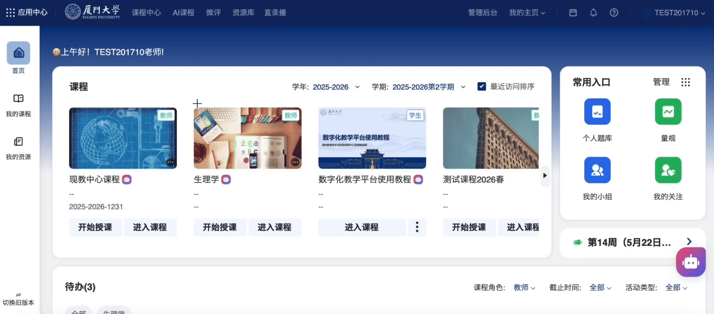 课程、待办、公告、常用功能汇总,教师可直接查看最近访问课程、待办事项及重要通知等,无需在多个页面间切换。