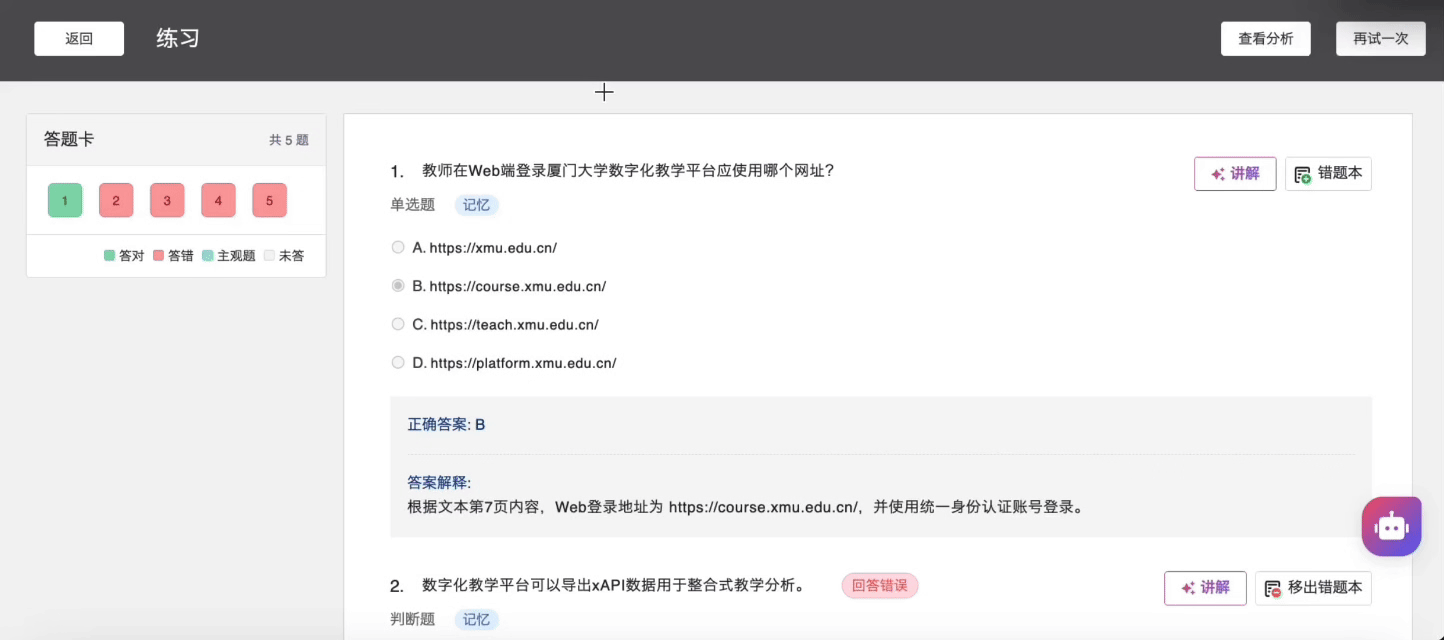 AI自动生成随堂测试,基于课件语义切片生成题目,学生扫码作答,正确率与易错点实时呈现,教师可随时调整教学节奏。